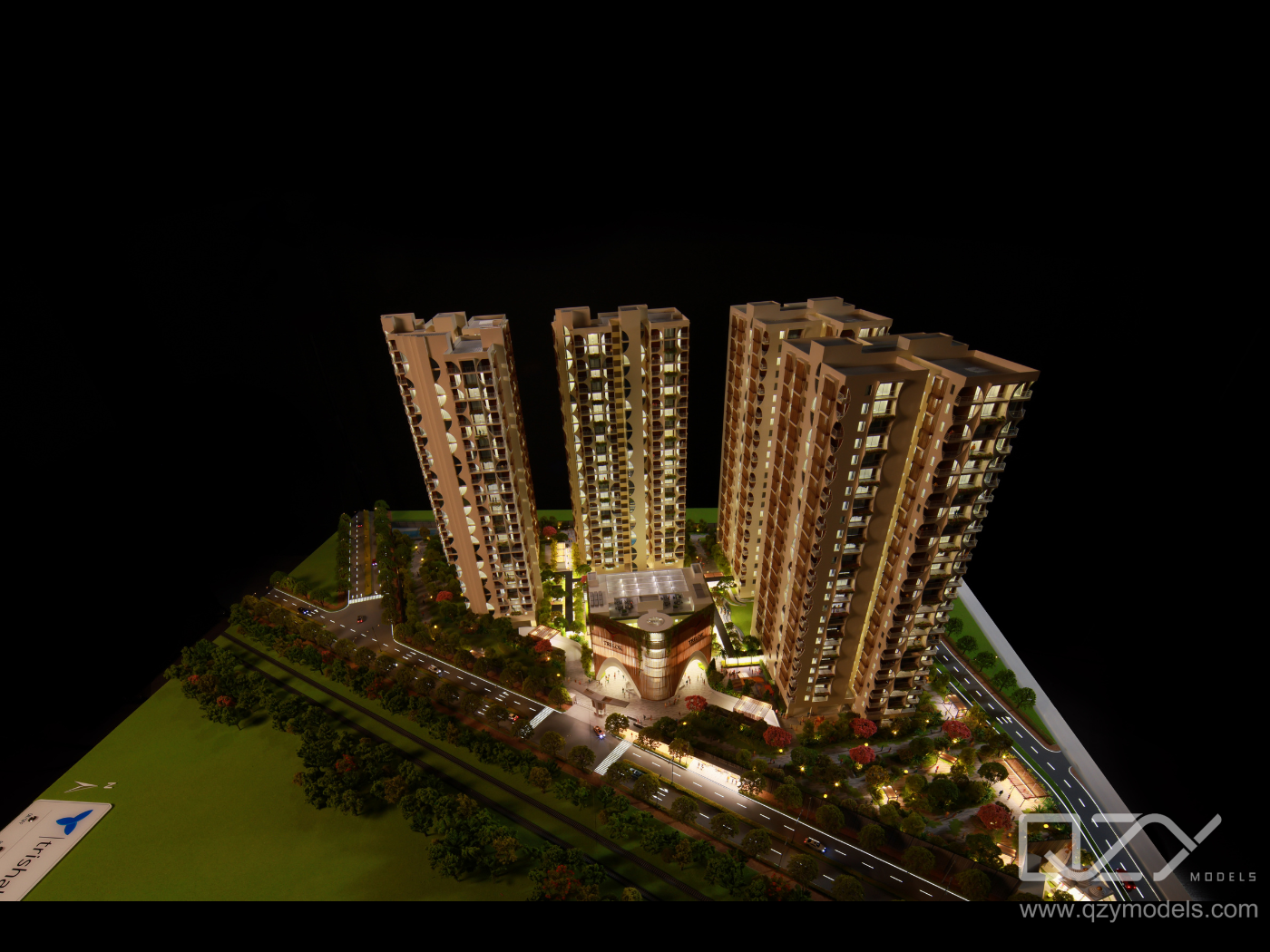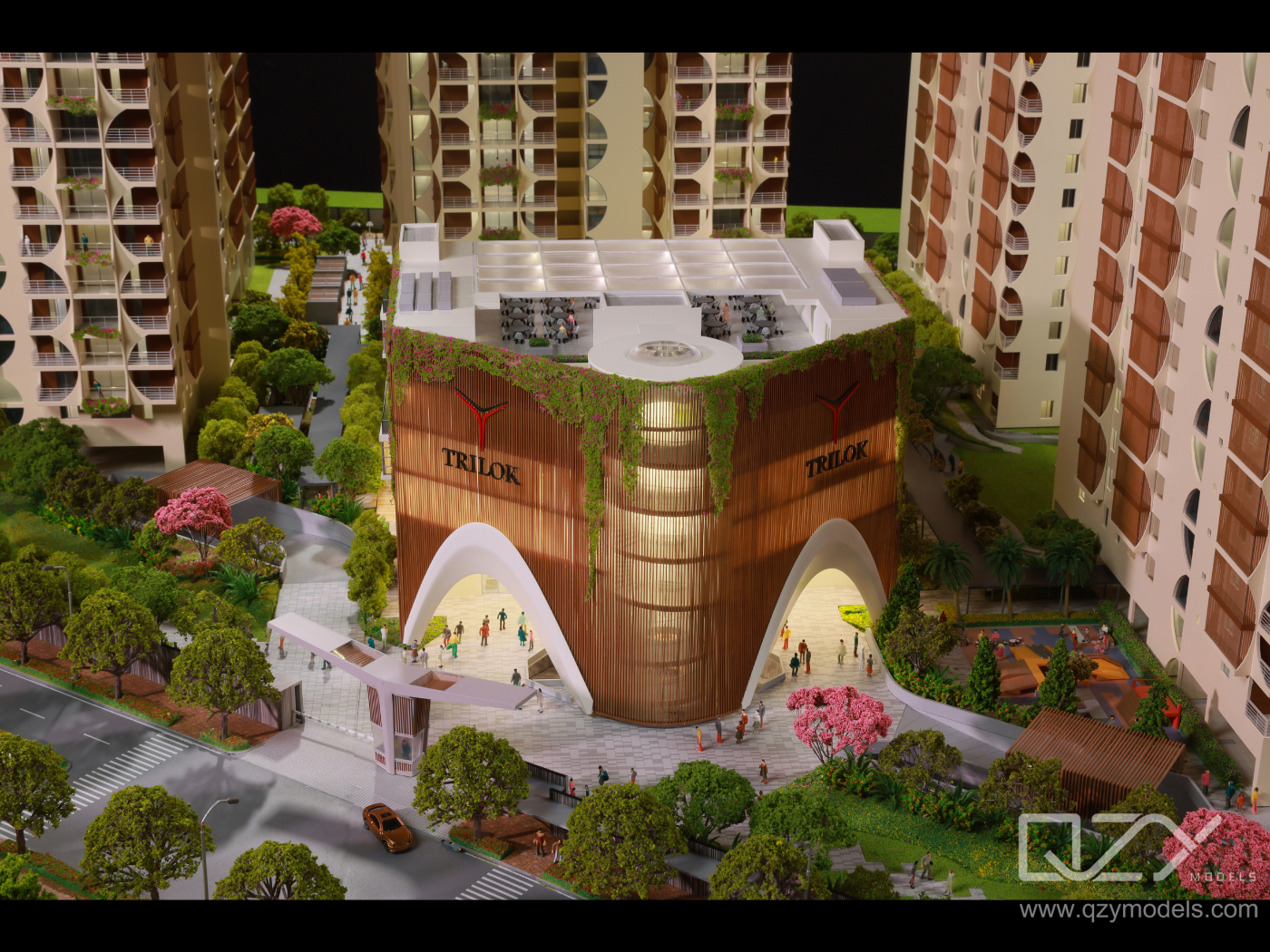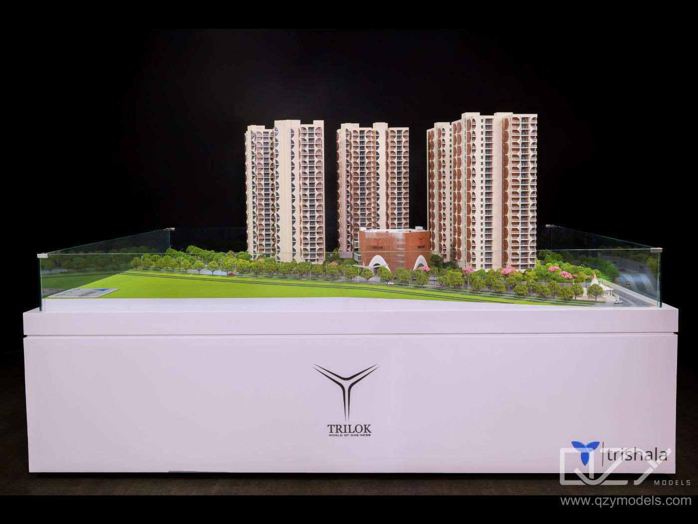 The 1:150 Trilok Residence model by QZY Models is a finely crafted architectural scale model representing the luxurious Trilok residential development in Hyderabad. Designed with precision for a 30-day production cycle, the model captures detailed features of the high-rise towers, landscape, and urban context, making it essential for visualization, client engagement, and presentation in residential real estate marketing.